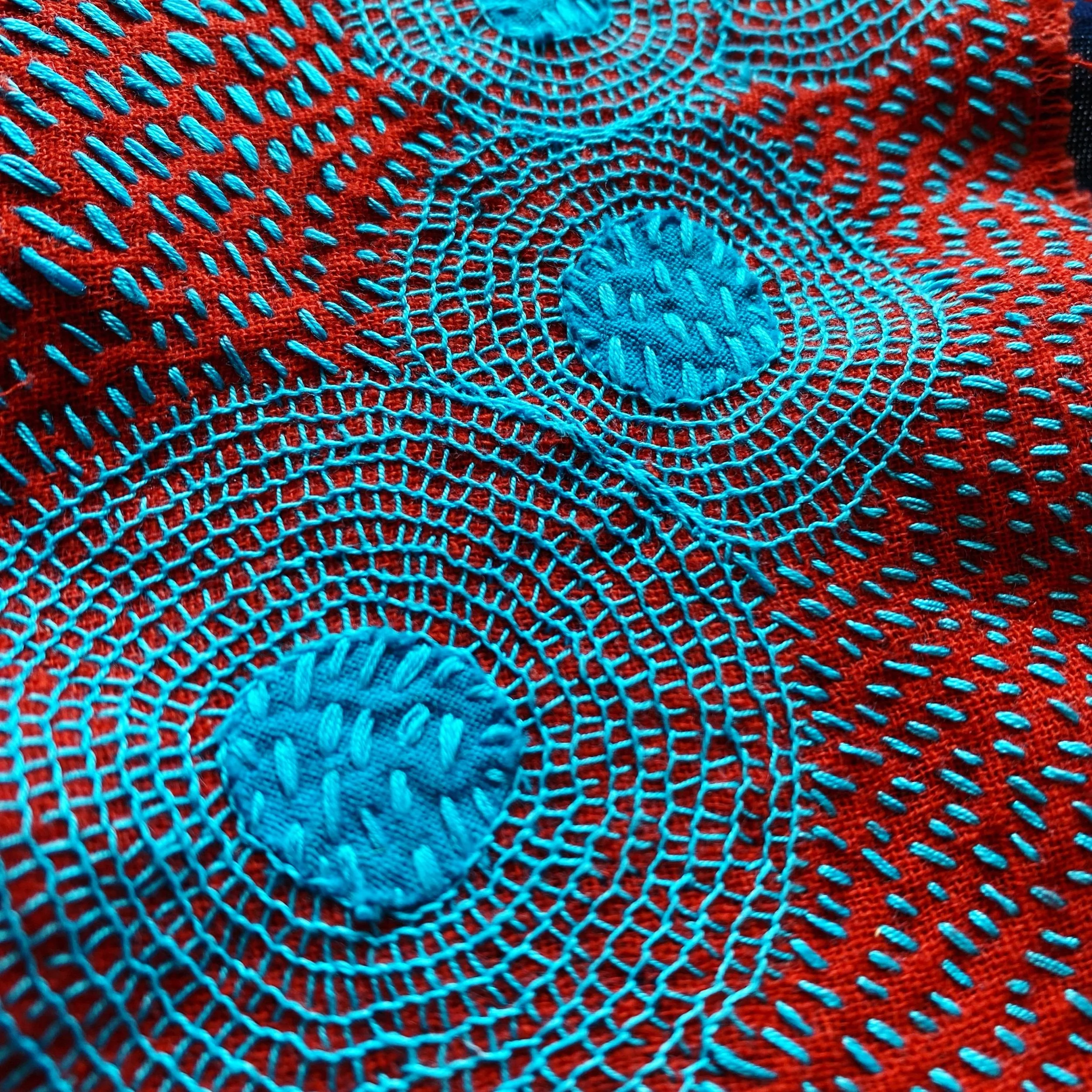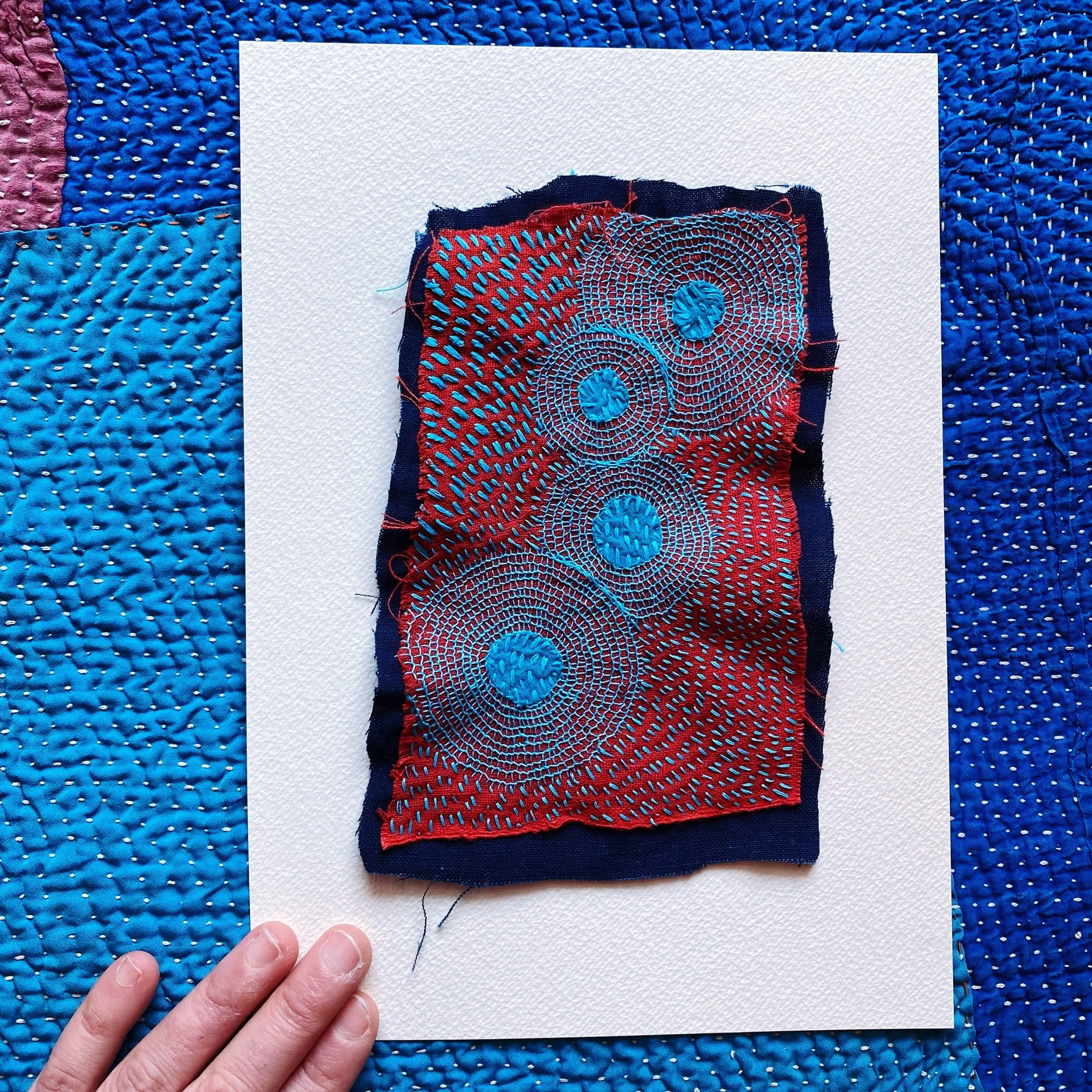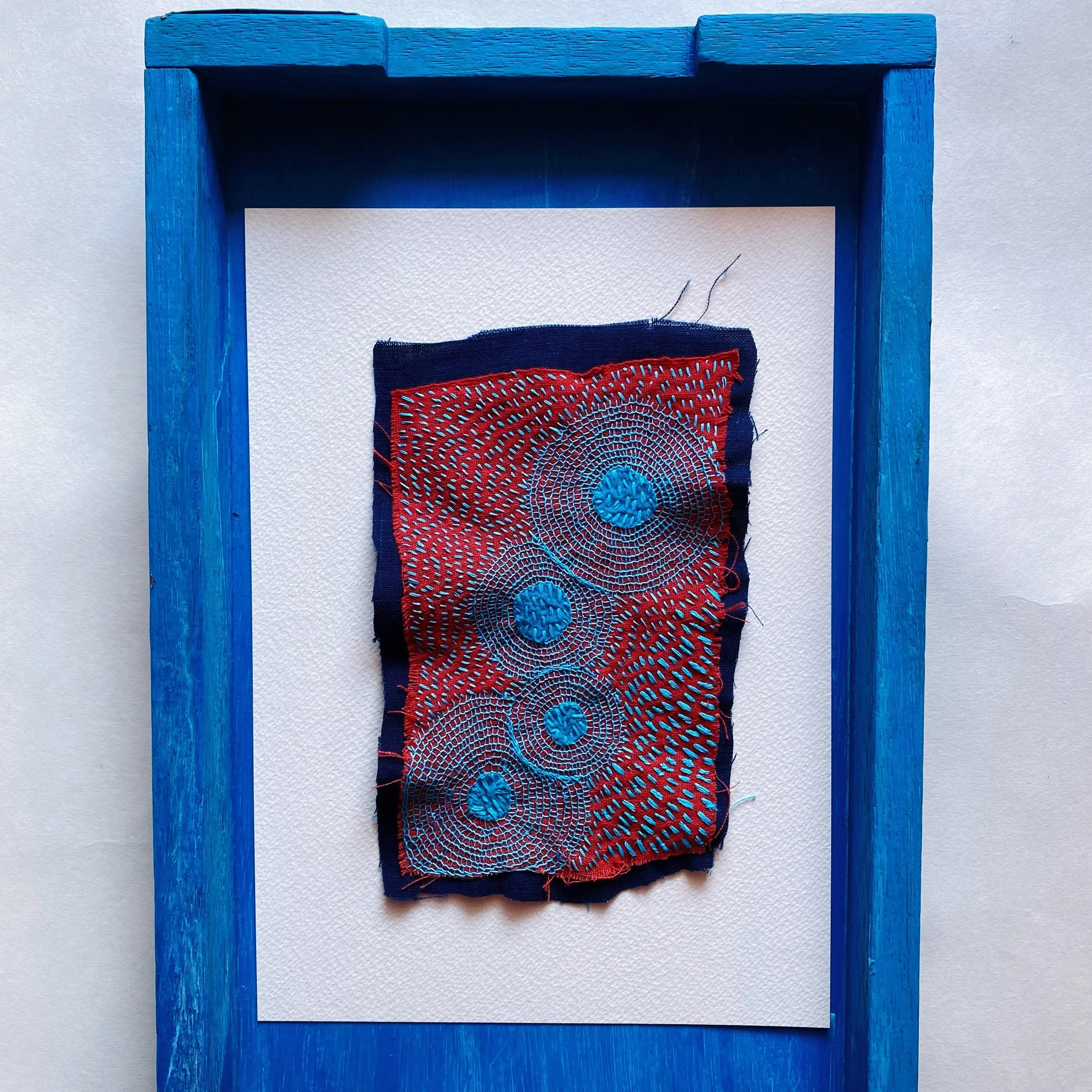 These small-scale works emerge from an ongoing investigation of connection and gravitational pull. Through systematic mark-making on found textiles and patchwork, the pieces map invisible forces—the way bodies orbit one another, how attention tethers and releases, the physics of longing.