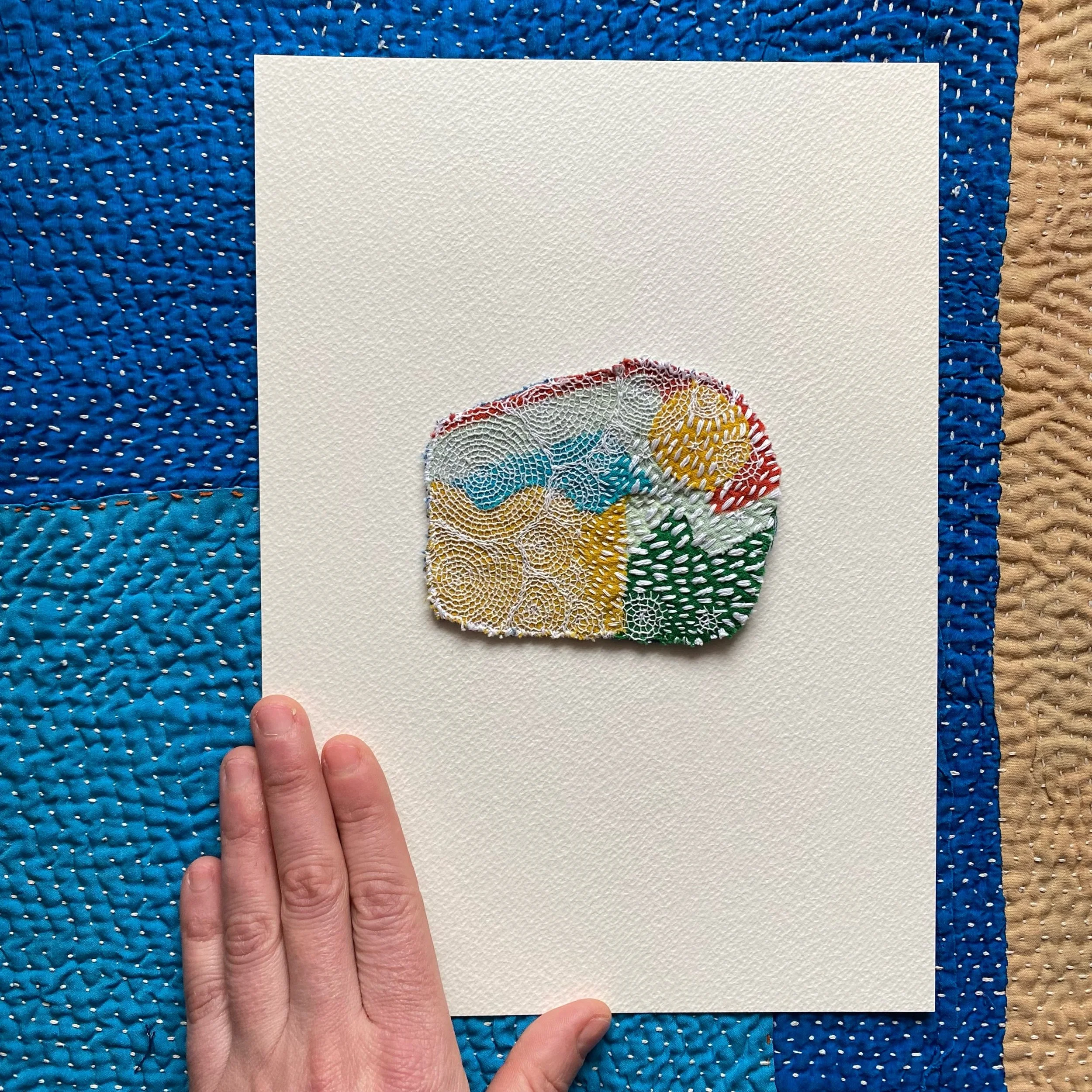 A small, intricate piece built through slow, repetitive stitching on antique Japanese textiles, exploring connection through accumulation. Each work is made by hand over many hours—no two are ever the same.